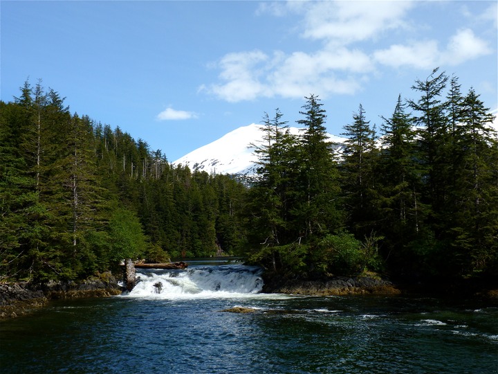 Near Sitka, this waterfall is from a lake that flows into the ocean. When the glaciers receded, the land near the mountain decompressed from the weight of the glacier more rapidly than the adjacent land. This caused the land to rise above the ocean and form a freshwater lake from the runoff of the mountain.